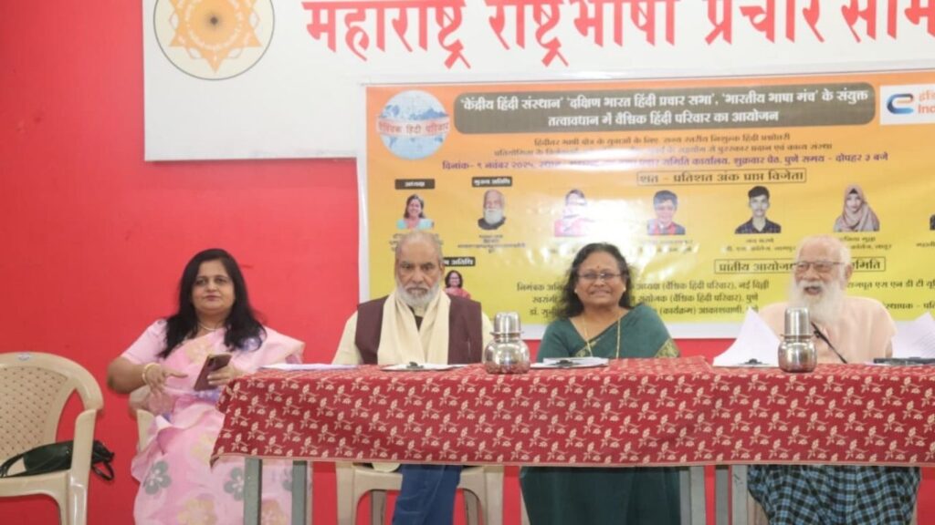 वैश्विक हिंदी परिवारतर्फे आयोजित राज्यस्तरीय ऑनलाइन हिंदी स्पर्धेत 5097 हिंदीतर तरुणांचा सहभाग. पुण्यात झालेल्या सन्मान सोहळ्यात अतिथींनी सांगितले—हिंदीला कोणताही धोका नाही; तरुण पिढीच हिंदीचे भविष्य आहे.