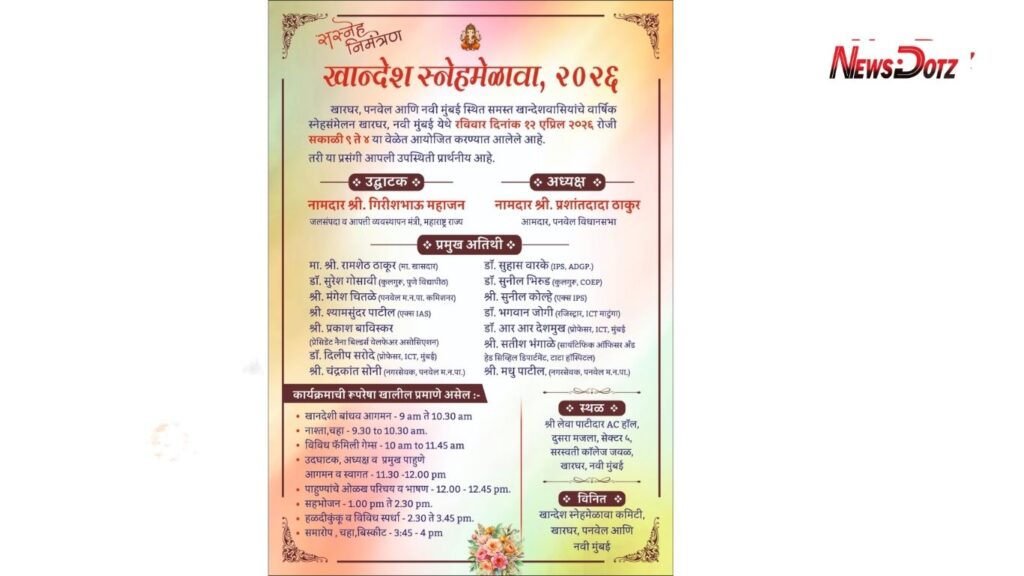 खारघर येथे १२ एप्रिल २०२६ रोजी खान्देश स्नेहमेळावा आयोजित. गिरीश महाजन उद्घाटक, प्रशांतदादा ठाकूर अध्यक्ष. फॅमिली गेम्स, मार्गदर्शनपर भाषण, सहभोजनासह विविध उपक्रम.